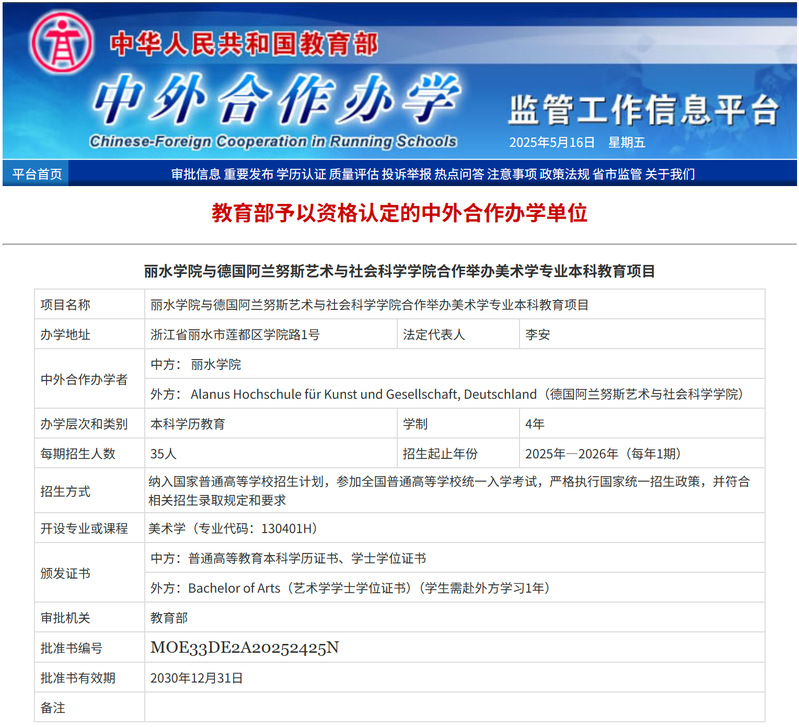 近日,教育部公布了2025年中外合作办学项目的最新评审结果。我校与德国阿兰努斯艺术与社会科学学院合作举办美术学专业本科教育项目成功获批(批准书编号:MOE33DE2A20252425N),这是我校继2013年与瑞典耶夫勒大学合作举办护理学项目之后又一新的中外合作办学项目获批,标志着我校在国际教育合作领域又迈出了坚实的一步。