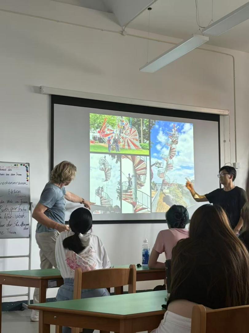 课程采用“双导师制”,其独特魅力在于中德思维的交融。布鲁内教授以德国艺术教育的严谨逻辑,将雕塑创作拆解为结构平衡与空间叙事,体现日耳曼民族的理性精神;包巍峰老师则担纲文化桥梁,用生动中文诠释专业术语,化解跨文化理解障碍,将抽象概念转化为可感意象。双导师的精髓在于互补:德国理性框架为中国艺术注入结构意识,中国感知智慧为西方理论赋予文化温度,让学生在两种思维的碰撞中实现精准而深刻的知识吸收。