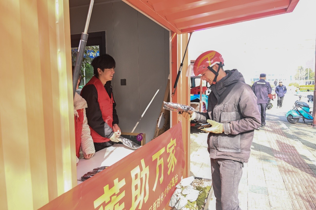 会场启动仪式圆满落幕后,我院志愿者迅速响应,赴往社区分会场,开展志愿服务活动,为在寒风中工作的快递员、外卖员和环卫工人送上了保暖手套,并细心询问他们的实际需求。
