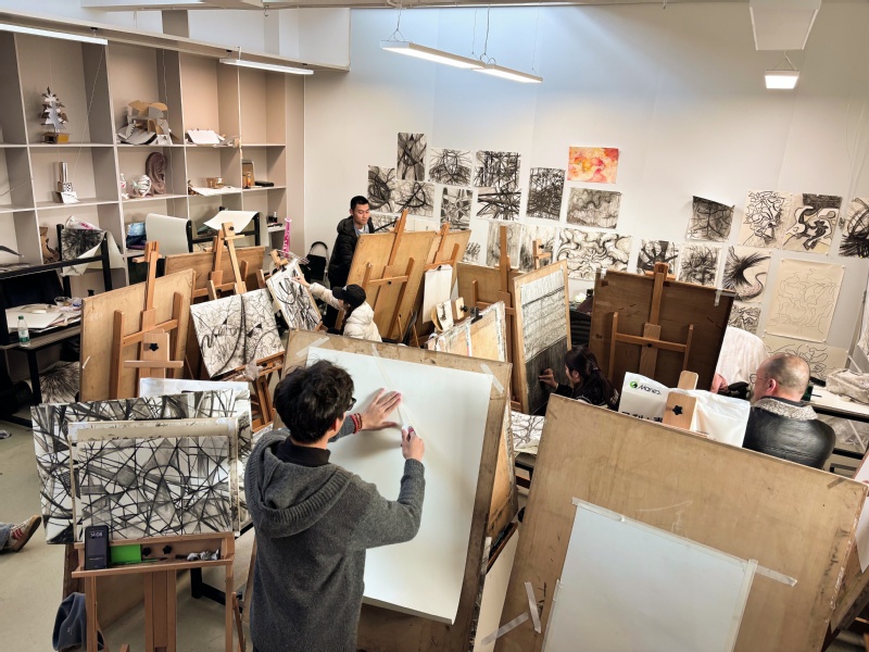 课堂四周墙面挂满了学生习作:狂放的线条交织,细腻的笔触铺陈,在黑白灰的丰富层次中,清晰呈现出学生从观察实物到提炼抽象语言的创作轨迹。周莉副院长认真观摩教学,对课程有机融合中外教学理念、着力培养学生创新思维的模式给予充分肯定。她特别勉励师生重视德语语言学习,为深入理解合作方艺术理念奠定基础,同时要持续深耕艺术语言表达,为专业的可持续发展和国际化特色筑牢根基。
