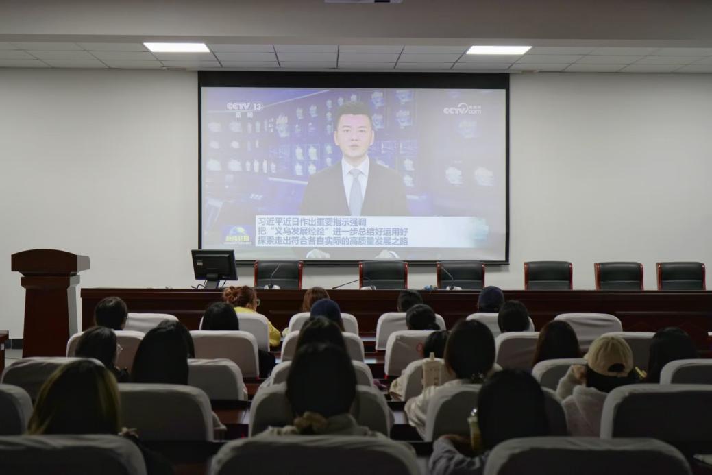 为深刻领会习近平总书记对浙江发展的关心与嘱托,4月23日晚,我院组织全体学生党员在14-304集中收看新闻联播中关于习近平总书记近日作出的重要指示,将“义乌发展经验”进一步总结好运用好,探索走出符合各自实际的高质量发展之路。