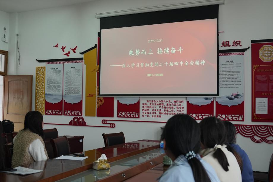 为深入推进学习贯彻党的二十届四中全会精神走深走实,10月31日,我院辅导员饶芷瑄在知止楼306面向全体发展对象专题宣讲党的二十届四中全会精神。