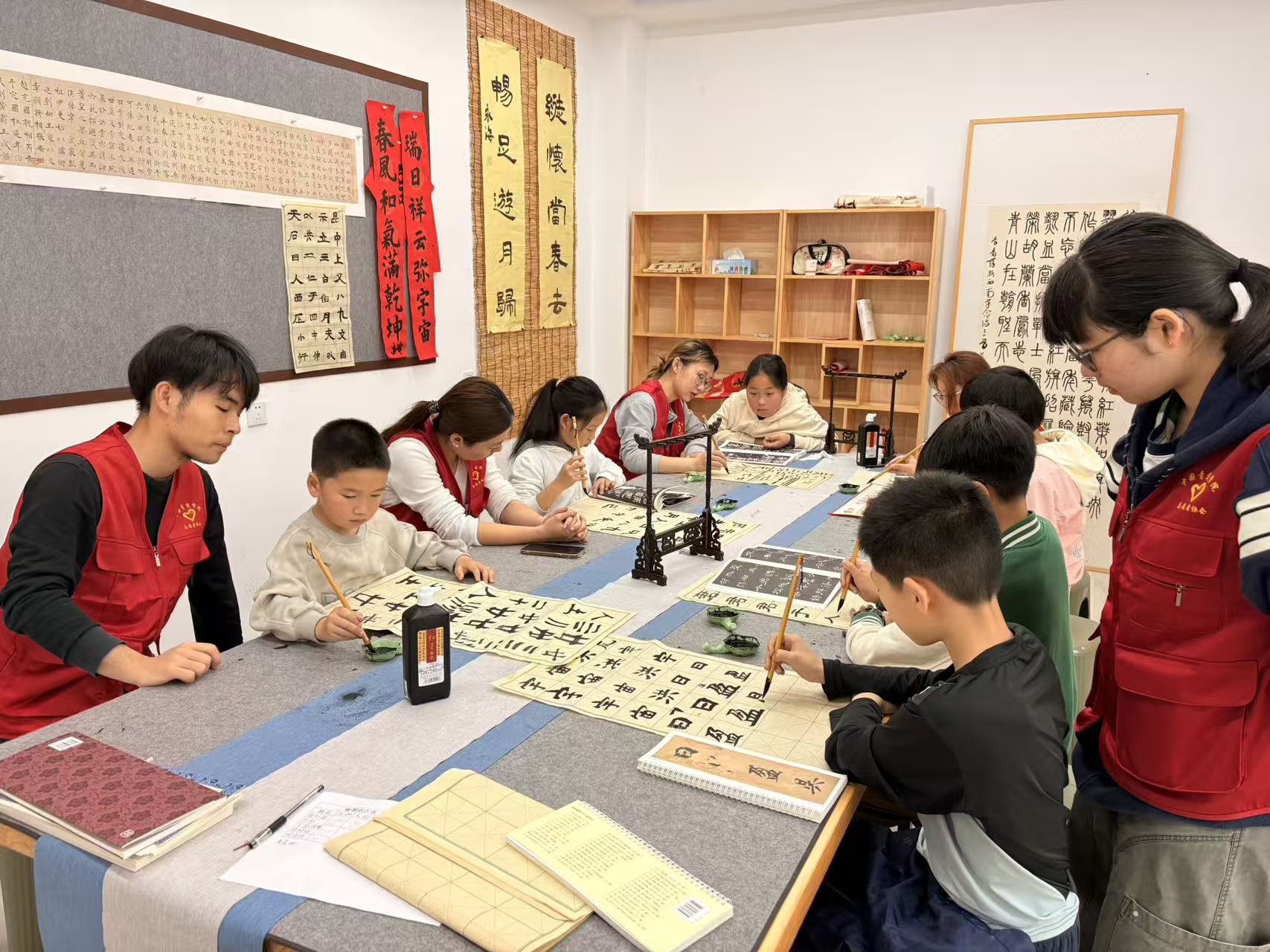 课堂上,来自中国青瓷学院的志愿者们化身指导老师,为社区青少年开展书法系统教学。志愿者们耐心每一个细节,引导孩子们在一笔一画中感受汉字的形体之美、文化之韵。孩子们端坐桌前,铺纸,运笔。志愿者们穿梭于书桌之间,逐字逐句点评指导,在互动教学中传递温暖与知识,让公益课堂成为高校学子与社区青少年双向成长的文化阵地。活动尾声,孩子们纷纷展示自己的书法作品,志愿者与孩子们共同合影,定格墨香相伴的温暖瞬间,为本次公益书法课堂画上圆满句号。